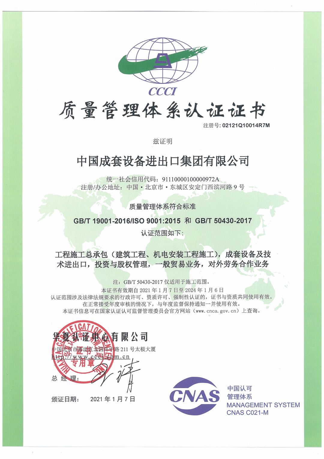 质量管理体系认证证书 GB/T 19001-2016/ISO 9001:2015和GB/T 50430-2017
