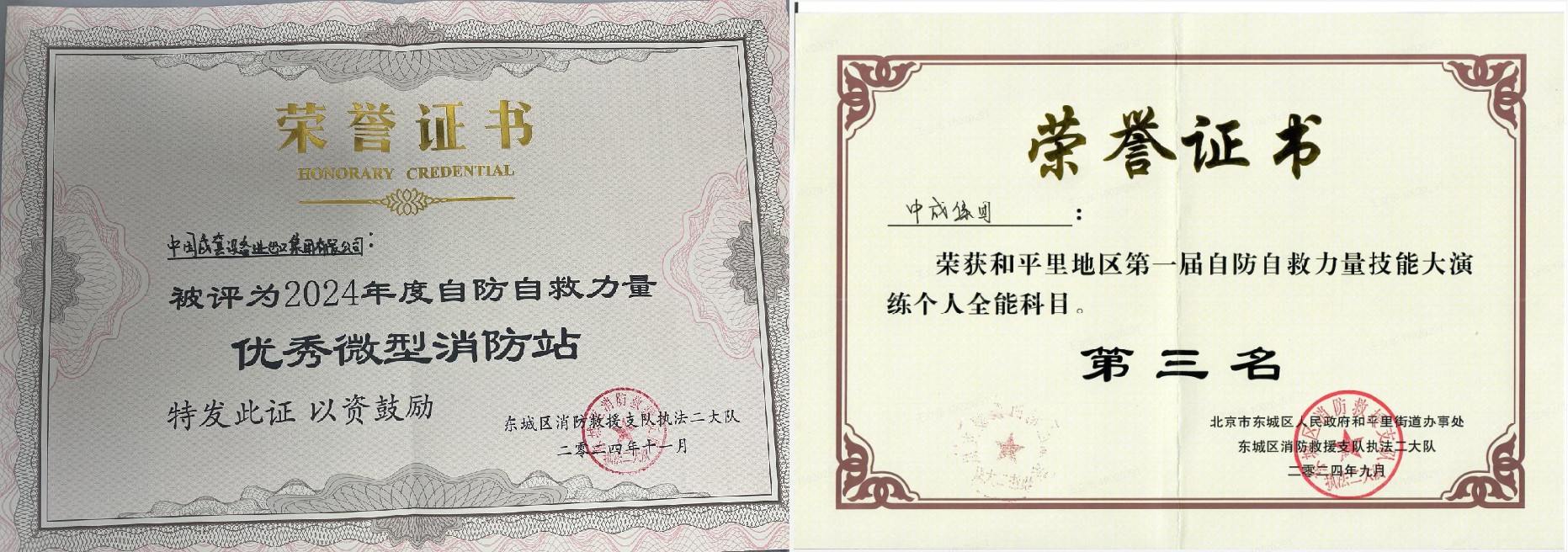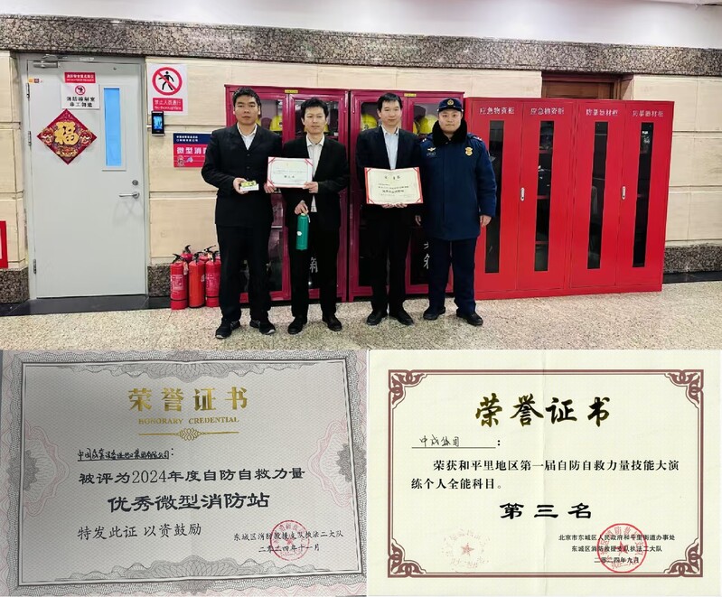 12月23日,北京市东城区消防救援支队授予中成集团大厦“2024年度自防自救力量优秀微型消防站”称号。