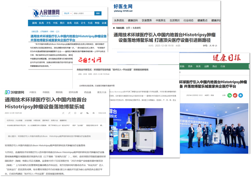 人民健康网、中国卫生网等垂直领域权威媒体,对环球医疗引入的中国大陆首台Histotripsy超声组织碎化技术肿瘤治疗设备的临床价值给予高度关注,评价其“将加速全球前沿医疗技术在中国的临床应用”,为国内肿瘤诊疗格局带来革新性影响。