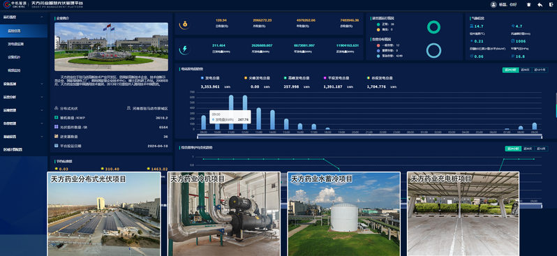 该项目在天方药业有限公司厂区内实施了较为完整的综合智慧能源项目,包括光伏、高效冷源系统节能改造、水蓄冷、充电桩等。